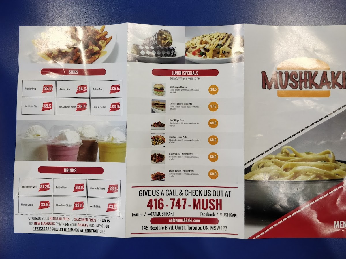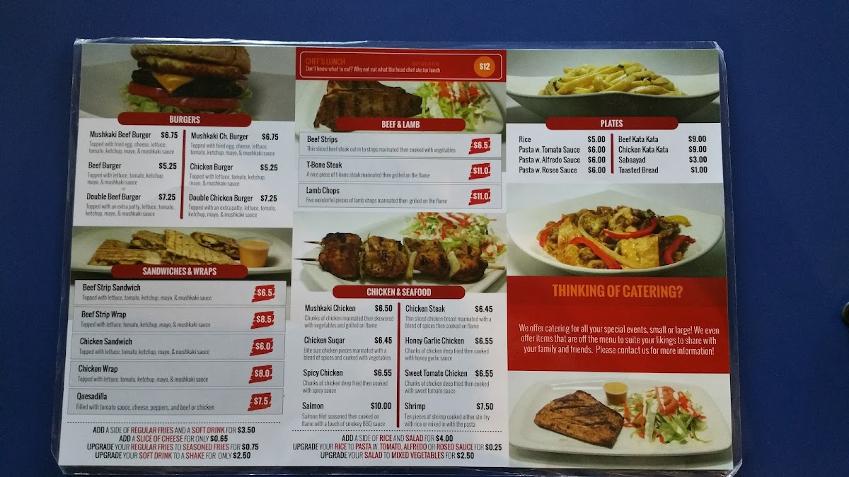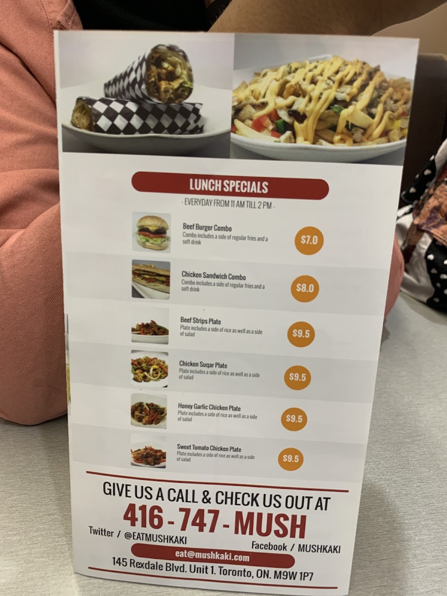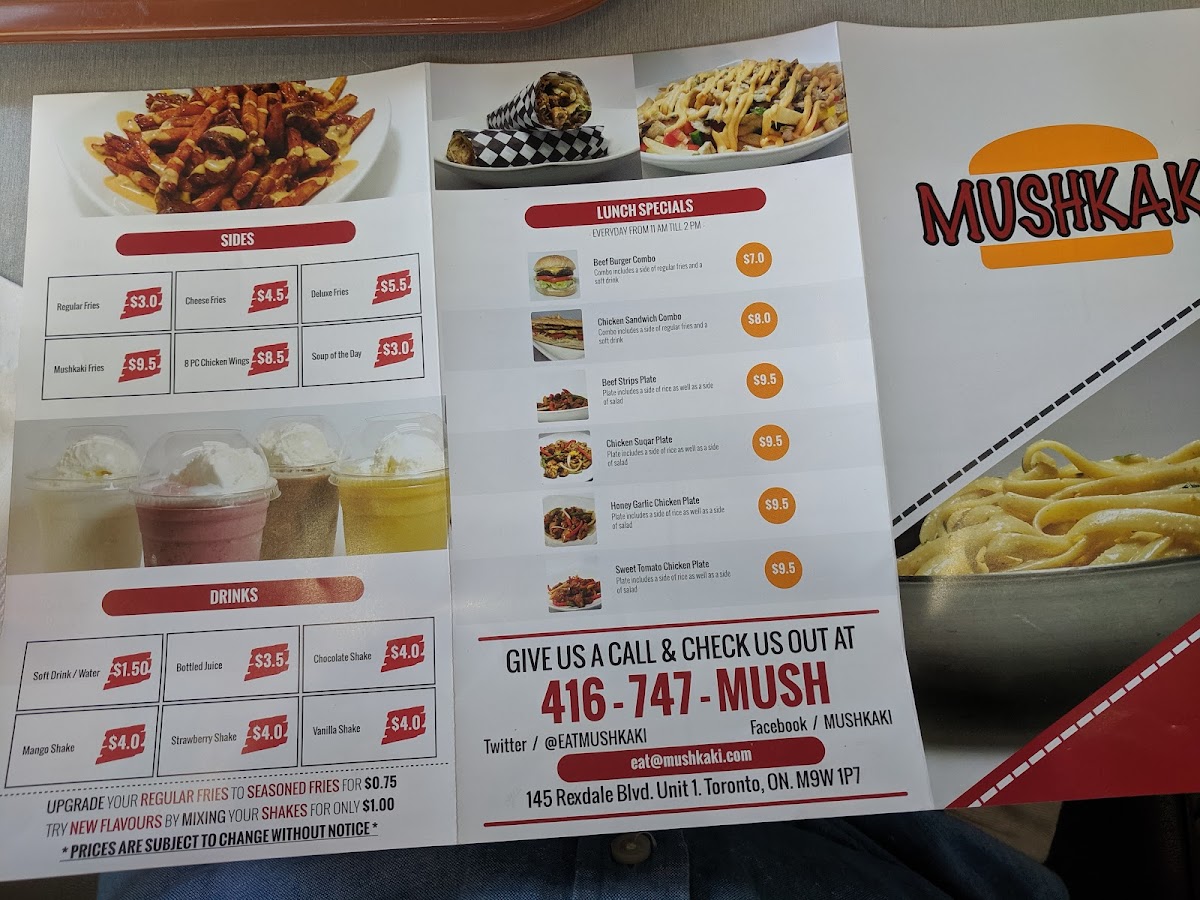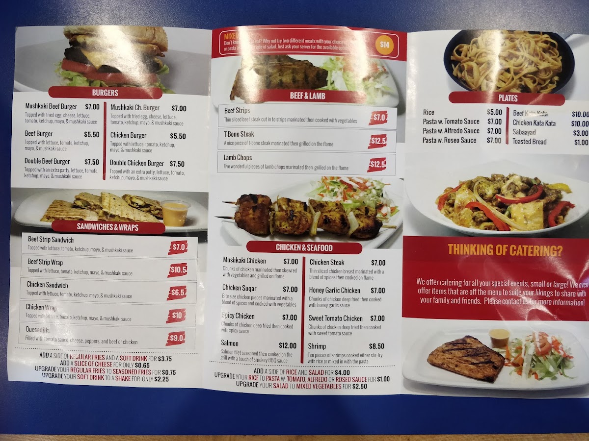 The star dishes include a range of pasta offerings, from the creamy Roseo Sauce Pasta to the classic Tomato Sauce Pasta, each priced at a delightful CA$9.00. The Chicken Kata Kata and spiced Basmati Rice highlight the depth of flavor that Mushkaki is known for.